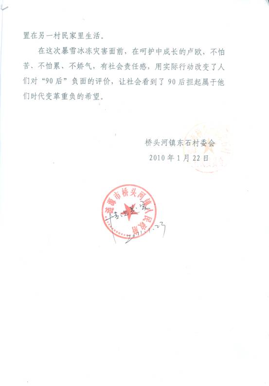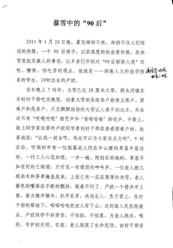 今天,我们很高兴地看到,通控系2008级电信二班卢欧同学身上闪现出了这种人性本善的光辉。在2011年年初这场大雪中,卢欧表现出来的责任感与善良品质让我们感受到了温暖,看到了希望——雷锋精神没有死,中华民族的传统美德在延续!
