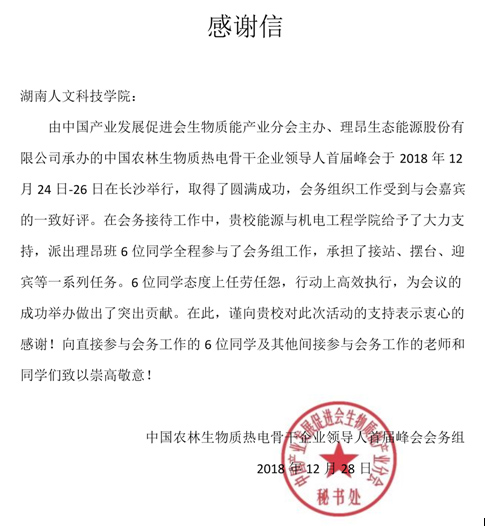 能源与机电工程学院部分师生参加中国农林生物质热电骨干企业领导人首届峰会,并协助会务组承担了部分会务组织与接待工作,受到参会人员及主办单位的高度评价。