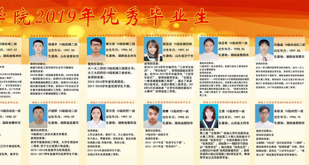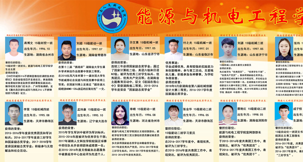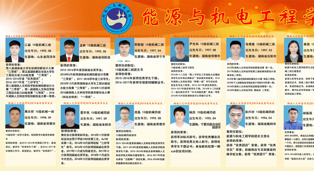 能源与机电工程学院全体教职员工,坚持把立德树人作为中心环节,把思想政治工作贯穿教育教学全过程,实现全程育人、全方位育人,努力开创学院学生教育、管理工作发展新局面;开展了工科学生人文素质教育、学生党员精准帮扶、学院优秀教师评选、学生考研辅导、学风建设教育等主题宣传、教育、实践活动;为充分发挥先进典型示范引领作用,激励广大学生奋发向上、学习榜样;经能机学院推荐、学校评选,2019届毕业生中,有44位同学被评为省级、校级优秀毕业生、创新创业优秀毕业生。让我们以先进为榜样,深入推进转型发展和“双一流”建设,全面贯彻党的教育方针,努力把培养为学生有思想觉悟、有道德水准、有文明素养、能够担当民族复兴大任的创新型、复合型、应用型人才!(图、文 肖毅)