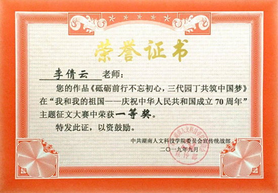 2019年9月,为庆祝中华人民共和国成立70周年,弘扬爱国主义精神,beat365英国官网面向全校师生开展“我和我的祖国——庆祝中华人民共和国成立70周年”主题征文大赛。大赛共征文53篇,按教师组、学生组分开评奖。经过专家组的精心评选,能源与机电工程学院机械设计制造及其自动化青年教师李倩云的《砥砺前行不忘初心,三代园丁共筑中国梦》作品荣获教师组一等奖。