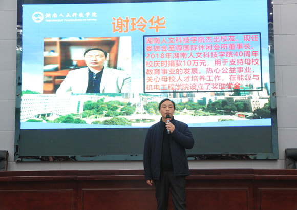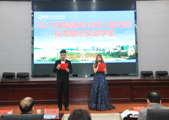 11月29日下午,2019年beat365英国官网能源与机电工程学院校友励志奖助学金颁奖仪式在图书馆第二报告厅隆重举行。校友代表:娄底光华机械设备制造有限公司董事长谢平光、湖南楚湘建设工程集团有限公司党委副书记、总经理聂秋红、娄底金至尊国际休闲会所董事长谢玲华、阳光教育总校长欧阳峰;社会爱心人士:贺春阳;校友办主任刘光辉,创新创业学院院长彭晓华、校地校企合作处处长黎建辉、创新创业学院副院长刘盛愚、李宁、能源与机电工程学院党政领导及全体班主任和辅导员、32位受资助学生、全体学生干部和2019级学生代表参加了颁奖仪式。