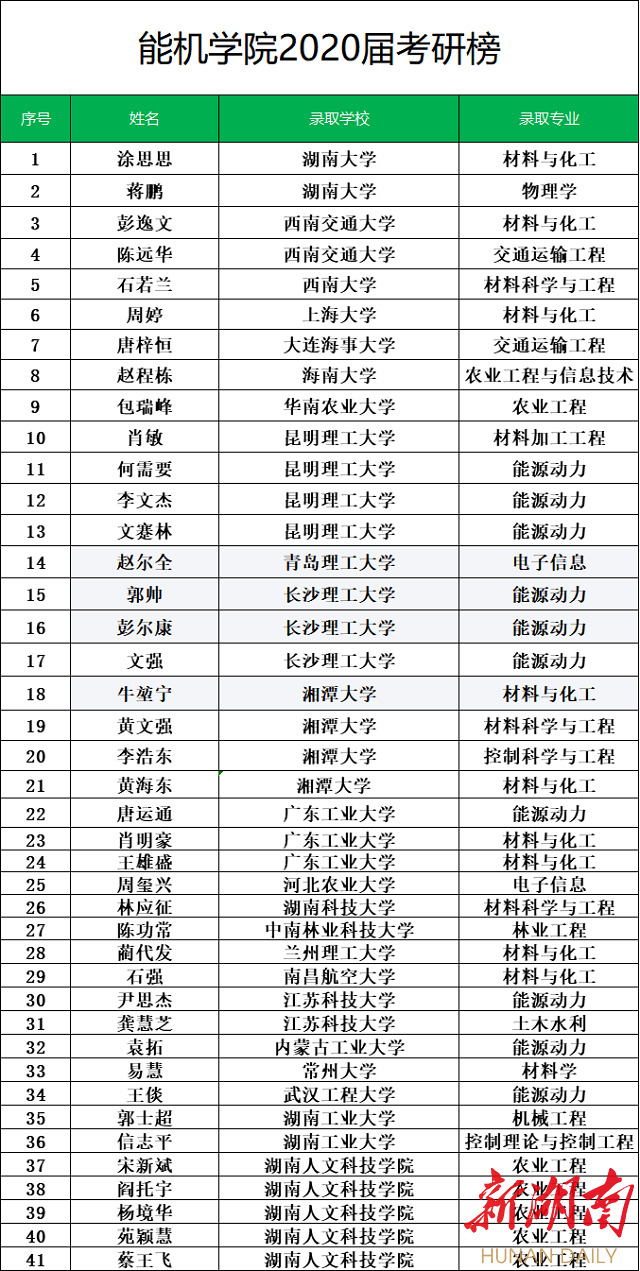 湖南日报·新湖南客户端9月11日讯(通讯员 邓景文)日前,beat365英国官网能源与机电工程学院(以下简称“能机学院”)传来喜讯,2020年应届毕业生考研,56人上线,41人被湖南大学、西南交通大学、西南大学等多所全国知名院校录取。近两年,学院应届毕业生考研上线122人,总共录取91人。