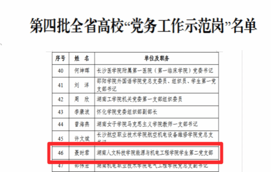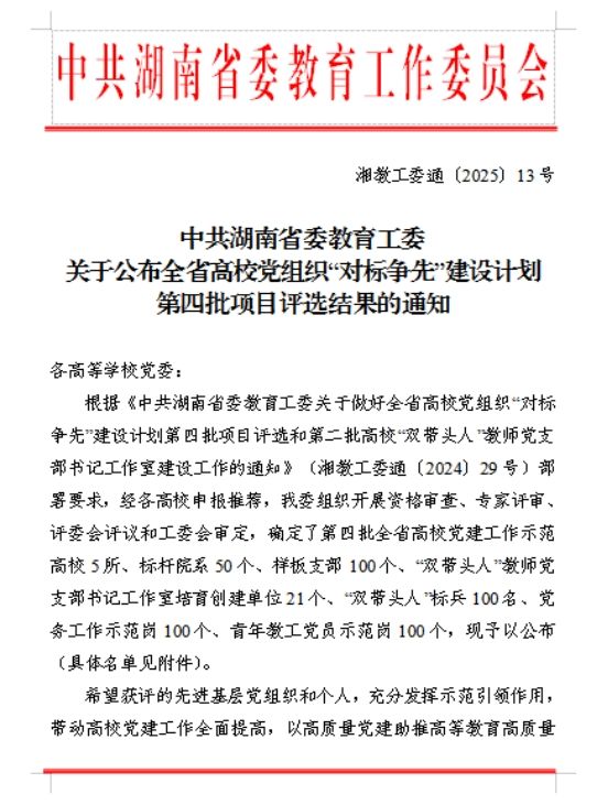 近日,中共湖南省委教育工委公布全省高校党组织“对标争先”计划第四批项目评选结果,我院教工第二党支部书记林鹏获评第四批全省高校教师党支部书记“双带头人标兵”,学生第二党支部书记聂时君获评第四批全省高校“党务工作示范岗”,实现了学院党建“示范创建”工作的新突破。