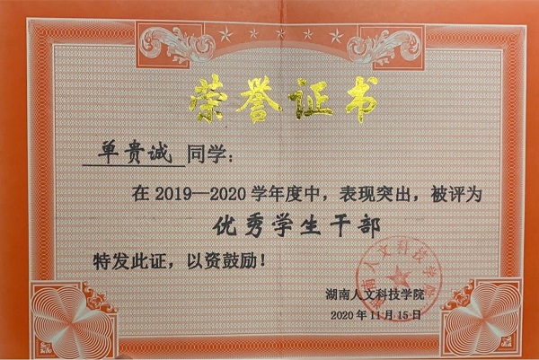 习总书记曾说“奋斗是青春最亮丽的底色,行动是青春最有效的磨砺。有责任有担当,青春才会闪光。”来自湖南省衡阳市的单贵诚一直谨记总书记教诲。在大学四年他拥有明确的规划。在思想上,他要求进步,自升入大学以来,他就以一名党员的标准严格要求自己,他立场鲜明,坚定拥护中国共产党的领导,他要求进步且树立正确的人生观和价值观,并通过不断的学习,最终成为了一名光荣的中共党员。在空余时间,他也在努力地完善自身,提高自己的思想觉悟和综合素质。