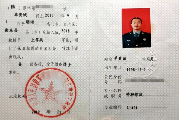 青春不以山海为远,志愿只向家国未来。庚续英雄血脉,把爱国之心化为报国之行。从小他便有一个参军梦,2017年高考结束之后,他便着手准备参军入伍,想在军队中磨练自己的意志,在2017年9月1日在湖南省衡东县应征入伍,服役于黑龙江特种部队。在部队他刻苦训练,吃苦耐劳,雷厉风行,服役期间的队列,体能,攀登,射击,特种小队战术,潜水,跳伞等训练成绩优异。于2018年被授予上等兵军衔,履行了保卫祖国的光荣义务,于2019年退役复学。