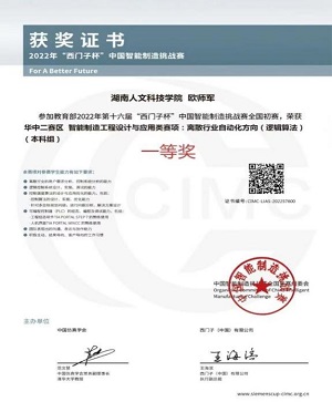 2022年获第十六届“西门子杯”中国智能挑战赛全国初赛离散行业自动化方向“一等奖”