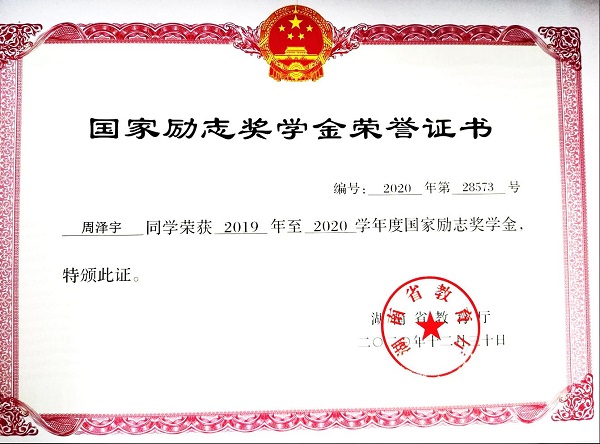 2020年获国家励志奖学金