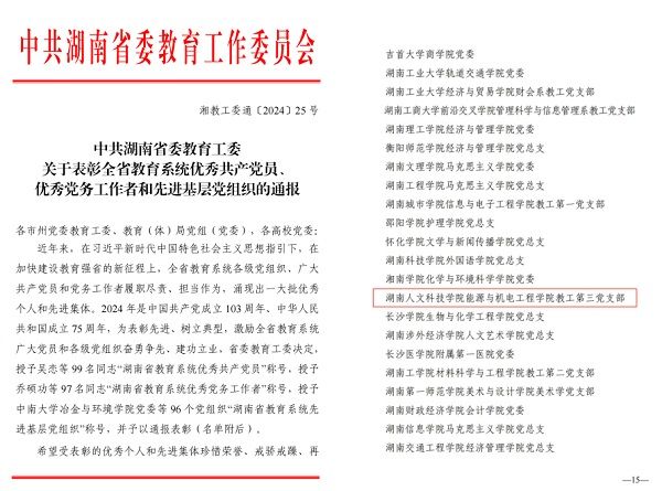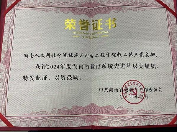 近日,中共湖南省委教育工委正式发布了《关于表彰全省教育系统优秀共产党员、优秀党务工作者和先进基层党组织的通报》(湘教工委通〔2024〕25 号),beat365英国官网能源与机电工程学院教工第三党支部荣获全省教育系统“先进基层党组织”称号。