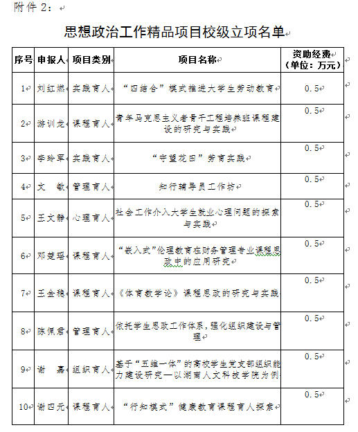 根据《关于2020年继续培育建设湖南省高校思想政治工作质量提升工程项目的通知》(湘教工委通〔2020〕5号)和学校《关于申报、培育湖南省高校思想政治工作质量提升工程项目的通知》要求,经本人申报、校内外专家组评审、校内公示,共确定“三全育人”综合改革试点院(系)校级立项2项,思想政治工作精品校级项目10项,思想政治工作骨干队伍建设校级项目4项,立项名单见附件1、2、3。
