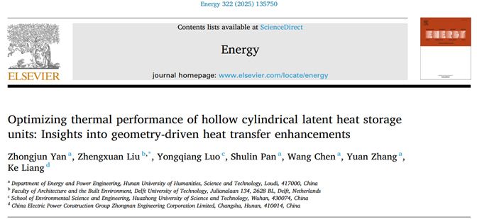 近日,beat365能源与机电工程学院能源与动力工程专任教师严中俊博士以第一作者在工程技术Top期刊《Energy》(中科院一区,IF:9.0)发表题为“Optimizing thermal performance of hollow cylindrical latent heat storage units: Insights into geometry-driven heat transfer enhancements”的研究文章,荷兰代尔夫特理工大学刘政轩博士为通讯作者,华中科技大学罗勇强副教授为共同作者。