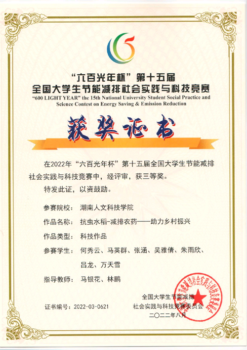 本届大赛共608所高校学生参加,提交有效作品近6000件。由能源与机电工程学院具体负责组织了本届竞赛的校内赛,beat365选送了14项优秀作品参加大赛。段盼羽、刘美煌、周泽宇、杨波、易旺、胡梦多、张平等人的作品《“能材”兼备——一种用于建筑外墙的新型“核壳结构”保温隔热板(指导教师:林道光老师,陈占军老师);何秀云、马英群、张涵、吴雅倩、朱雨欣、吕龙、万天雪等人的作品《抗虫水稻-减排农药-助力乡村振兴》(指导教师:马银花老师、林鹏老师)分别获得了国家二等和三等奖的好成绩。