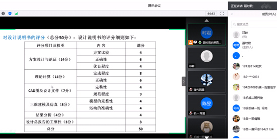 7月15日上午10点,能源与机电工程学院通过腾讯会议进行线上2020年工程训练综合能力竞赛动员会。能源与机电工程学院领导、机械专业指导老师和学生共70余人参加了本次会议,会议由聂时君老师主持。