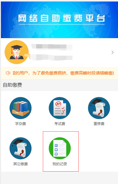 3、登录成功之后进入主页面,学生可以通过不同的缴费入口,缴纳自己需要缴费的项目。