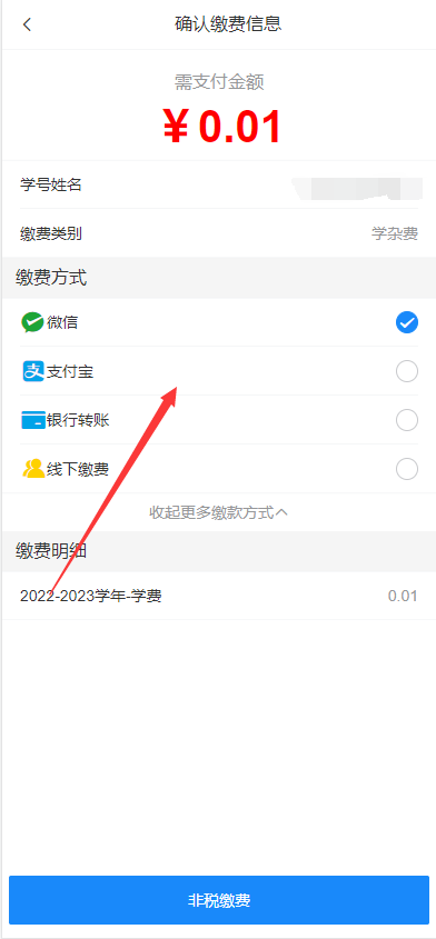 4、左边选中对应待缴费项目,右侧铅笔图标修改对应项目的缴费金额,确认缴费项目和金额信息选择无误之后,点击右下角去支付,跳转到订单页面。缴费方式可以选择微信或者支付宝,再点击下方非税缴费,跳转到支付页面。支付成功后点击我已支付成功返回。