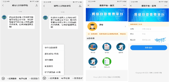 2、进入微信公众号,点击左下方的校园服务下的学生自助缴费菜单,进入缴费登录页面。点击游客,输入学号或身份证号码、姓名、验证码,点击缴费/查询,登录主页面。