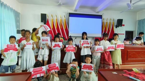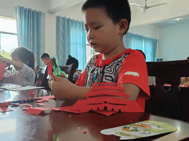 在实践操作环节,孩子们积极地使用剪刀和红色卡纸,在支部志愿者的悉心指导下,通过折叠、绘图、裁剪等步骤,最终完成了以天安门为主题的剪纸作品。这一过程不仅锻炼了孩子们的动手能力,也加深了他们对爱国主义的理解和感受。