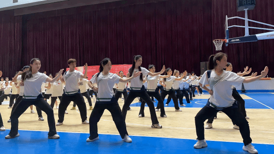 本次大赛由体育学院主办,旨在全面提升学生的专业素养和实践能力,以适应体育教育和体育产业的发展需求。大赛内容包括队列队形,广播体操,梅山武术三个项目。在队列队形环节中,舞蹈表演专业学生气势高昂、步调一致、动作标准娴熟、舒展自然、英姿飒爽,展现出了21级体舞班的学生扎实基本功和严肃活泼、团结一心的精神面貌。赢得观看师生的阵阵掌声。在广播体操环节中,舞蹈表演专业学生准备充分,每一个细微的动作,都经过无数次的打磨与调整,力求精准无误,每一次排练都凝聚着团队的智慧与汗水。在梅山武术环节中,舞蹈表演专业学生步伐坚定,矫健生风,他们虎虎生威、一展身手,昂首或下蹲,旋转或跳跃,以一招一式、展现出21级体舞班的亮丽风采,也展示着梅山武术的精深玄妙,更演绎出武术文化的华彩乐章。