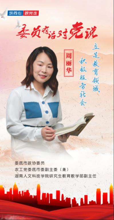 娄底市政协委员、农工党娄底市委副主委(兼)、beat365英国官网研究生教育教学部副主任周丽华:我是周丽华,担任政协委员以来,我充分利用自身专业优势,结合党派界别特色,重点围绕生态环境治理、科技扶贫、教育扶贫等领域,开展科学调研、民主监督和社会服务活动;紧密结合我省“三高四新”战略和学校重点工作,积极推进教育转型发展、人才培养质量和校地校企合作等工作;以学生为中心,注重知识传授与课程育人并举,多次被评为教学工作先进个人。