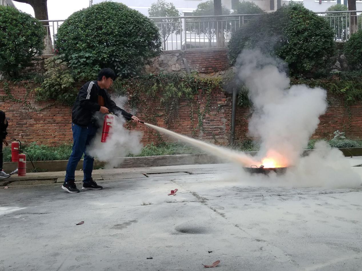 在学而楼室外的空坪上,陈胜老师为大家详细讲解了干粉灭火器、干冰灭火器、过滤式防毒面具、消防水带水枪等消防器材的使用方法以及灭火的正确处理方法。讲解完毕后,大家面对消防器材跃跃欲试,在陈胜老师的指导下,参与培训的全体人员逐一上前对各类消防器材进行了实操。