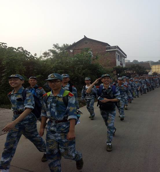 4点50分,随着军训团大队长何玉孜的一声令下,同学们精神抖擞、列队整齐的小跑出校园,本次军训拉练正式开始。