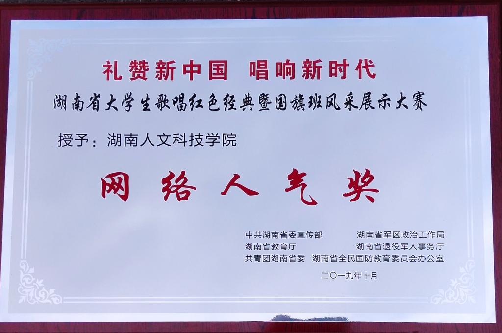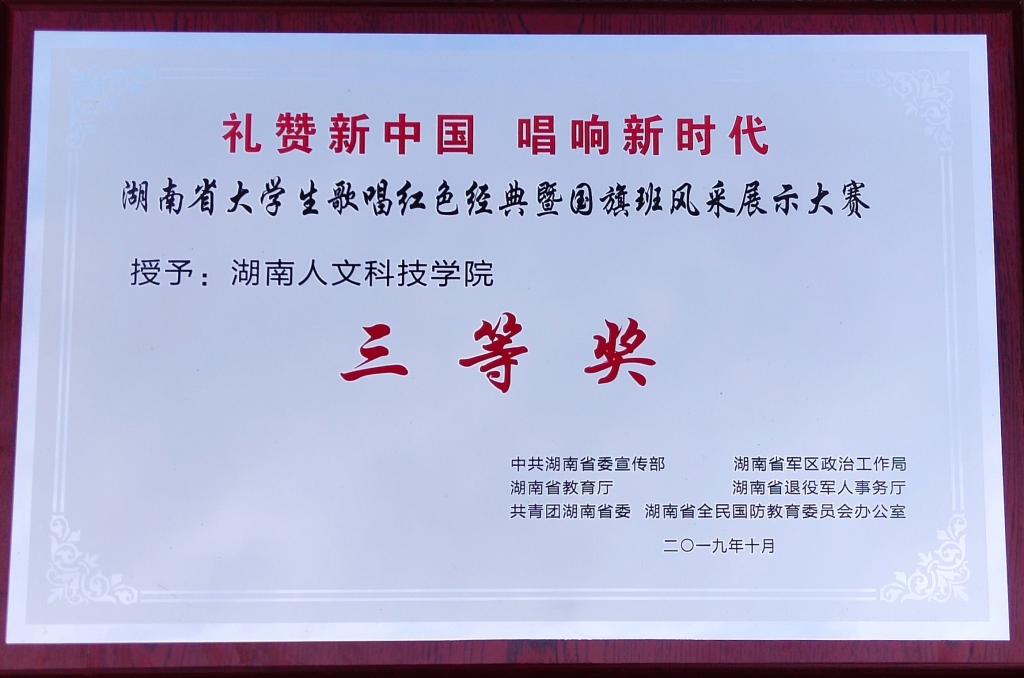 10月18日下午,以“礼赞新中国唱响新时代”为主题的湖南省大学生歌唱红色经典暨国旗班风采展示大赛颁奖典礼在湖南教育电视台举行。beat365荣获本次大赛三等奖及组织奖并喜获网络人气前三名。谢柳、胡坚毅、刘惠娟、周樑四名老师获得优秀指导老师奖。