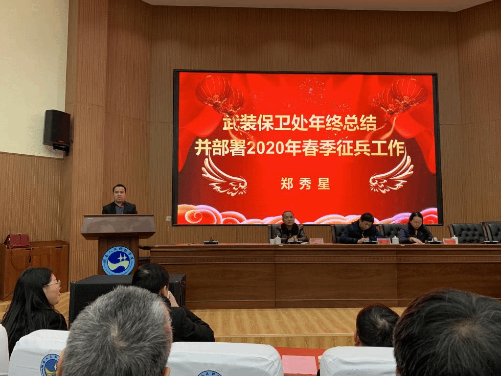武装部部长郑秀星首先回顾了2019年度征兵工作情况,学校共有86名大学生光荣入伍,其中从省内入伍68人,体育学院、农生院、商学院、能源与机电工程学院、数金学院、外国语学院、法学院超额完成任务。然后就2020年春季征兵工作的时间、任务、服务保障等方面进行了安排部署。