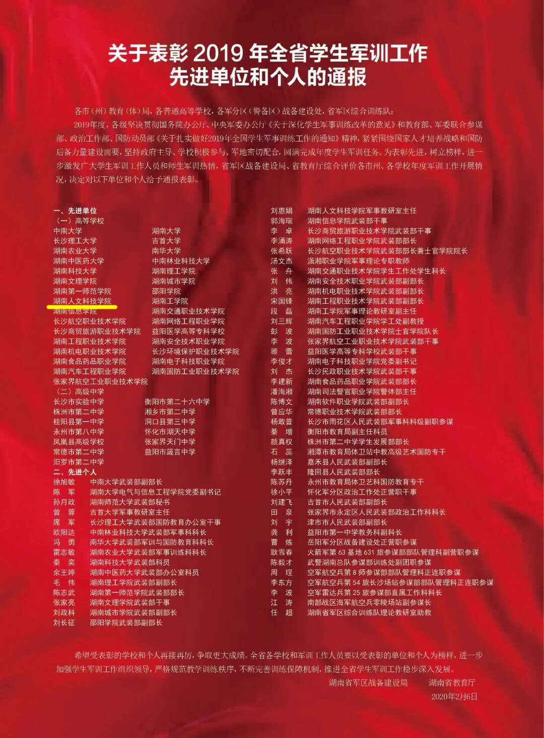 近日,省军区战备建设局、省教育厅联合发布《关于表彰2019年全省学生军训工作先进单位和个人的通报》(战〔2020〕87号),beat365获评“2019年全省学生军训工作先进单位”,校武装部刘惠娟获评“2019年全省学生军训工作先进个人”。