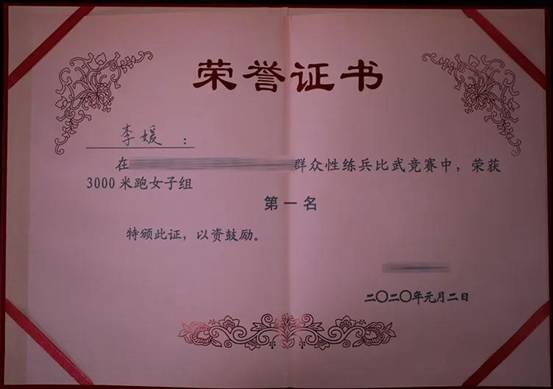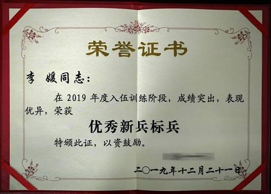 2019年入伍后,李媛一步一个脚印,不断拼搏进取。在三公里训练中,别人每天跑一趟,她跑两趟,主动加压进行负重训练;在爆发力训练,别人冲刺一圈,她冲刺两圈、三圈,甚至更多;在新兵入伍训练阶段群众性比武中,她以11分44秒的优异成绩勇夺女兵三公里第一名。单杠曲臂悬垂1分40秒,手榴弹投掷突破35米,战术基础动作等课目均达到优秀水平,李媛被表彰为“优秀新兵标兵”。短暂的入伍训练取得了骄人的成绩,她戒骄戒躁,继续奋蹄扬鞭以更高的标准完成专业训练。在体能消耗大、危险系数高的攀登课目中,她虚心请教,反复练习,不断突破,迷彩服湿了又干,干了又湿手掌的皮磨破了一层又一层,从第一次的39秒到后来的20秒,再到现在的12秒。厚厚的老茧见证了她的成长,磨烂的战靴见证了她的进步,李媛逐步从一名优秀大学生成长为一名合格的钢铁战士。