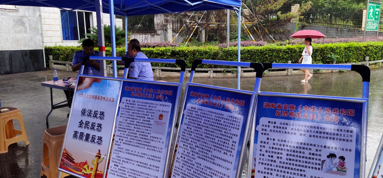 9月5日,正值beat365学生返校报到之日,保卫处联合娄底市公安局反恐支队及娄星分局指挥中心一起在学校东珠门举办了反恐宣传活动。通过宣传展板、发放宣传资料、咨询等方式向师生宣传反恐知识,提高师生反恐防暴意识。