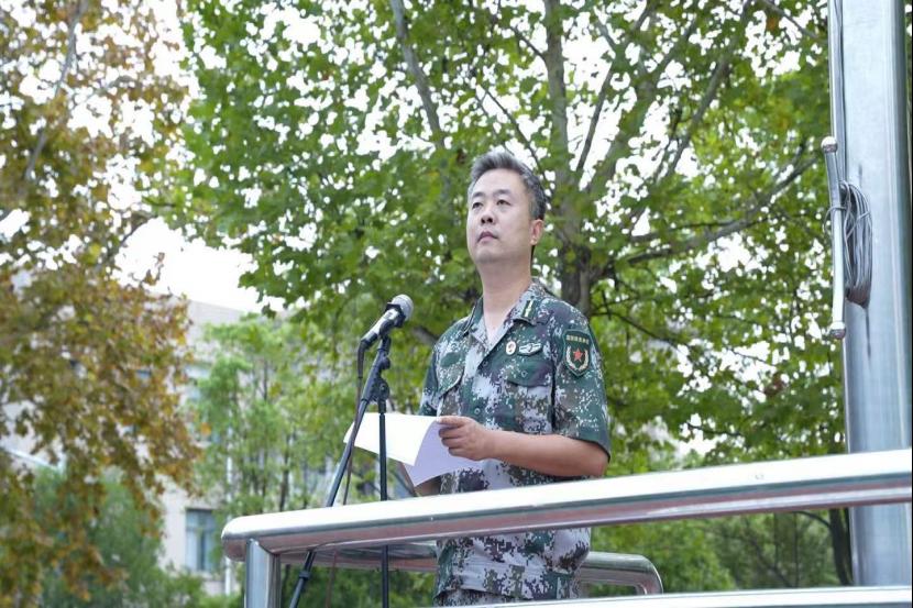 军训团政委陈刚带领师生回顾了沉痛的民族历史,告诫师生居安思危,警钟长鸣。他以“三要”为核心,鼓励师生要坚定不移跟党走,凝聚起民族复兴的磅礴力量;也要以史为鉴,面向未来;更要担当尽职,书写中国青年最靓丽的底色。
