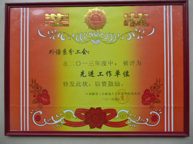 外语系分工会荣获2013年度先进工作单位