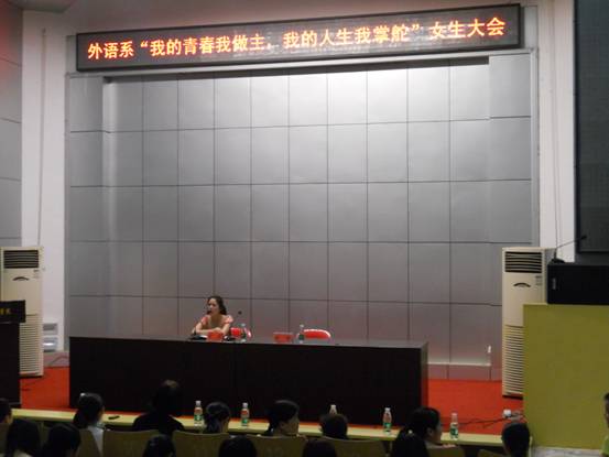 2012年5月17日晚7点30分,外语系在匠成楼进行“我的青春我做主,我的人生我掌舵”为主题的女生大会,参加大会的有外语系党总支书记胡瑾,党总支副书记刘莉、辅导老师以及大一大二的班主任。