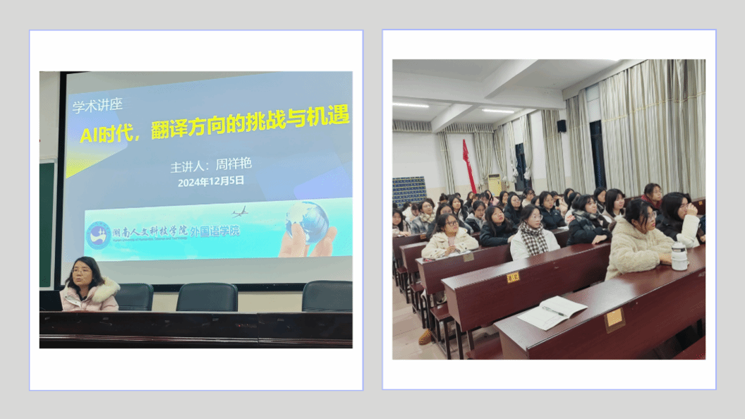 2024年12月5日晚,外国语学院周祥艳老师在播馨楼406教室举办了主题为“AI时代,翻译方向的挑战与机遇”的学术讲座。讲座由刘晓东副院长主持,2023级商务英语专业的学生积极参与。讲座深入探讨了人工智能技术对翻译行业的影响,并就翻译方向的学生如何在这一技术变革中应对挑战、抓住机遇提供了宝贵的见解。