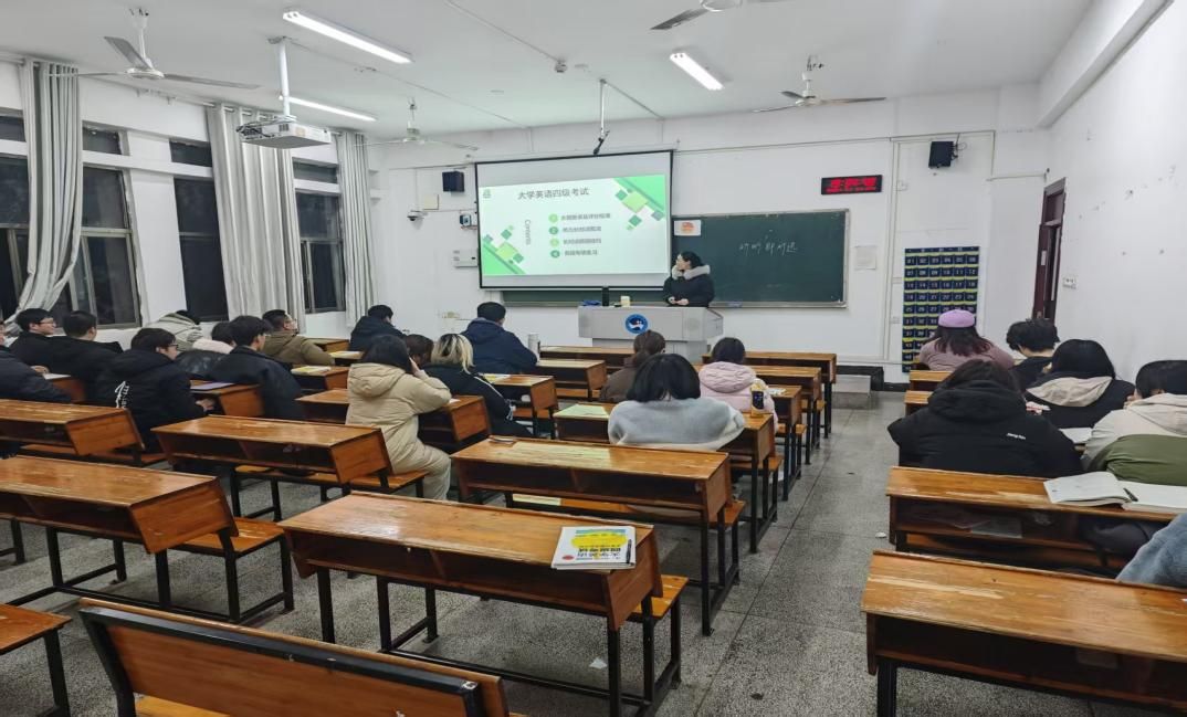 曾枫红老师:在讲解听力部分时,曾老师强调了预读选项、抓住关键词等重要性;阅读方面快速定位关键词并且理解句子结构,以及分享了写作的基本流程和常用结构,让学生及时掌握解题技巧,最后为大家提供了科学的词汇记忆学习方法。曾老师还提到了备考期间沉着冷静是非常重要的一点。无论是听力还是阅读,只有心静,才能将自己的所学技巧与单词运用到英语解题上,才能很快地捕捉到出题者的意图。同时,也要学会有技巧地训练。例如做阅读理解题需在速度与准确性间寻求平衡。所以在平日的训练当中就要学会计时,限制做题时间,增加紧迫感,模拟考试环境,这样才能更大程度的在考试中正常发挥。四级考试不仅是对英语知识的考查,更是对自我管理与坚持精神的考验。只要有决心与毅力,就能在挑战中不断实现自我超越。学生反馈良好,普遍认为在解题技巧与考试信心方面都有显著提高。