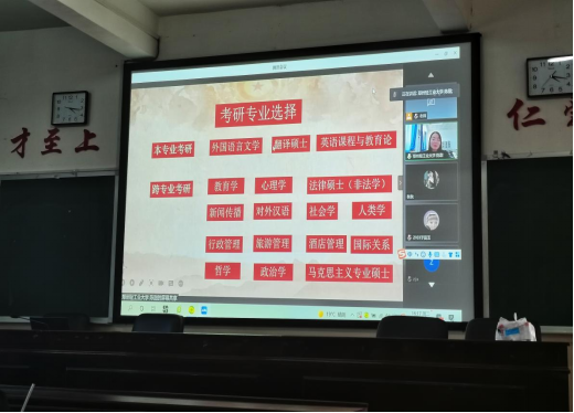 12月21日下午外国语学院于播馨楼406和养根楼报告厅分别举办了英语专业和商务英语专业2021专业导论线上讲座。因为疫情原因,讲座采取线上形式,由禹逸群主任、邓梦林主任分场主持,郑州轻工业大学副教授陈甜博士主讲。