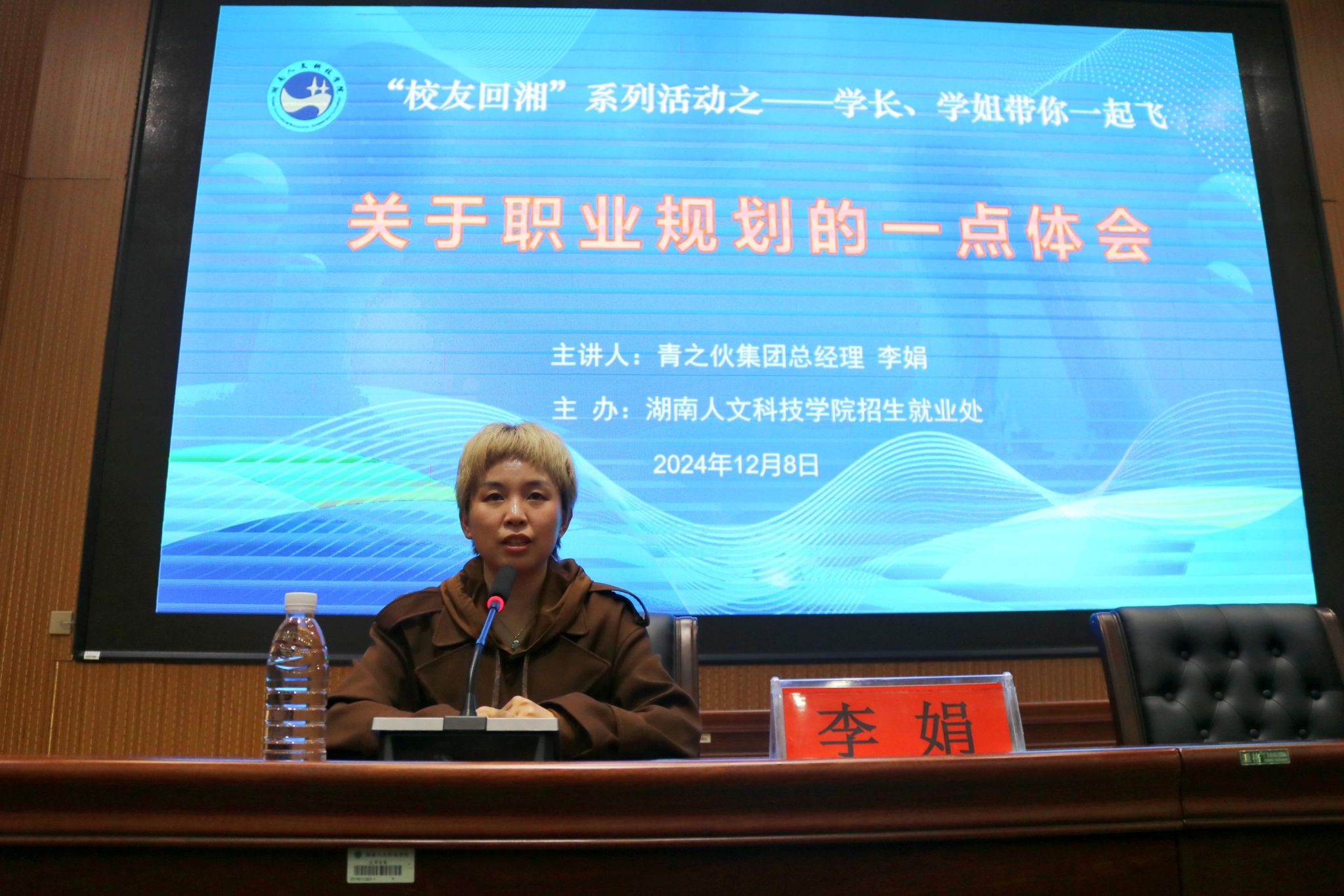 李娟女士分享了自身成长的故事,她为我们描绘了一幅从校园到职场,从梦想照进现实的精彩画卷。她的坚持、努力和创新精神,让学弟学妹们深受触动和启发,她从当前就业环境等方面客观分析当前国内就业形势,为大学生做好职业生涯规划、择业指明方法和路径。互动环节,学生们积极发言,李娟女士一一耐心回答。
