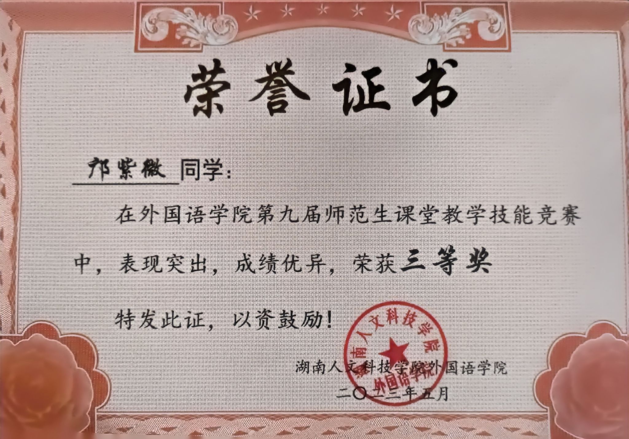 学习上,我始终锚定目标,奋力前行,优异的成绩、靠前的年级排名,是我逐梦路上的脚印。为了在专业知识的海洋中遨游得更远,我日夜钻研,课堂上紧跟老师思路,课后主动拓展阅读。这份努力让我斩获国家励志奖学金,在师范生技能大赛中崭露头角,还多次获评三好学生标兵。全国英语专业四级考试获优秀等级、取得高中英语教师资格证,更是见证了我在专业领域的深耕细作,让我在未来的教育之路上有了更足的底气。