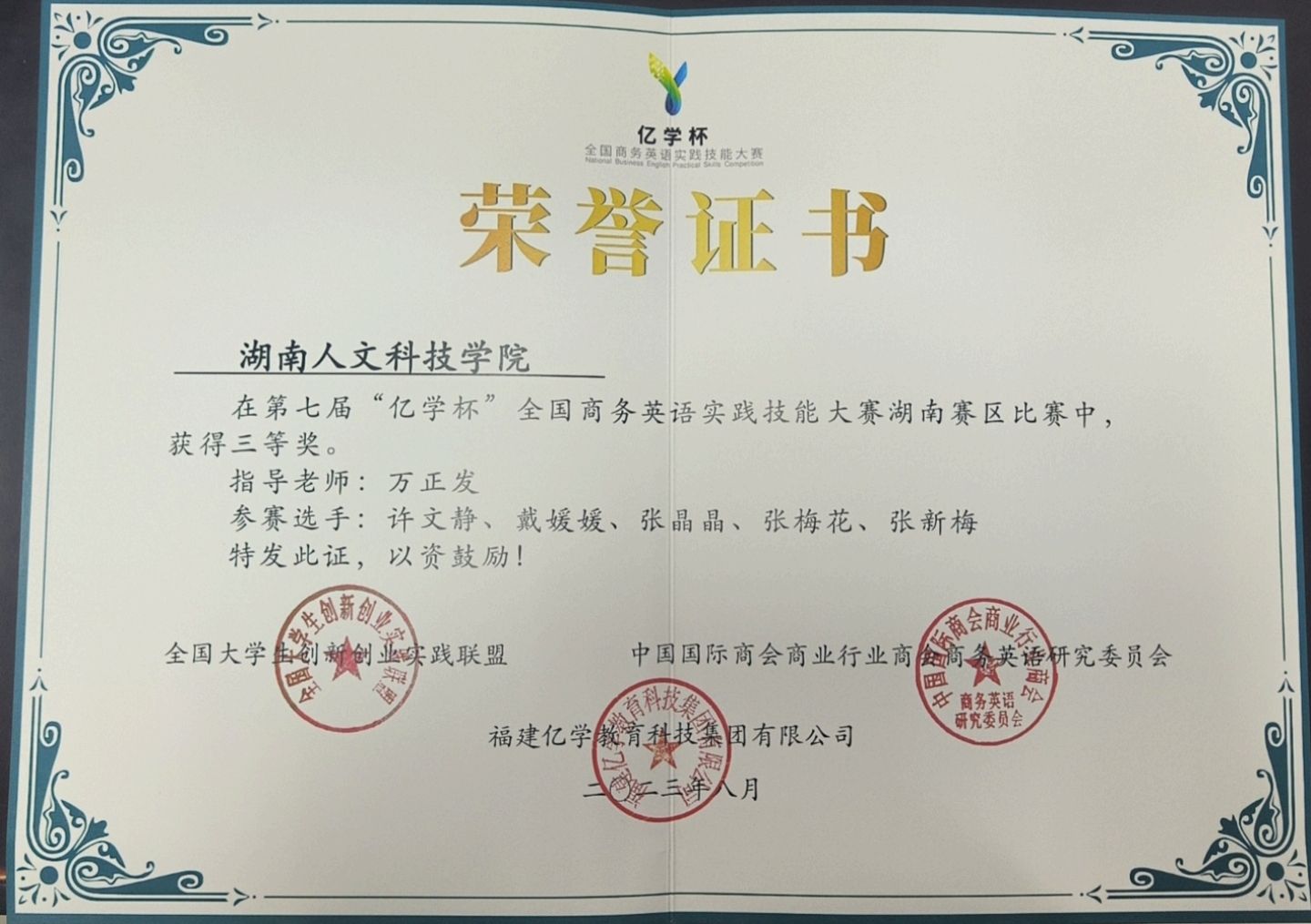 第七届“亿学杯”全国商务英语实践技能大赛湖南赛区三等奖