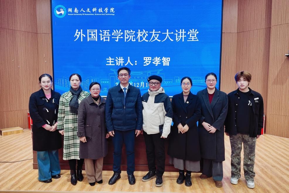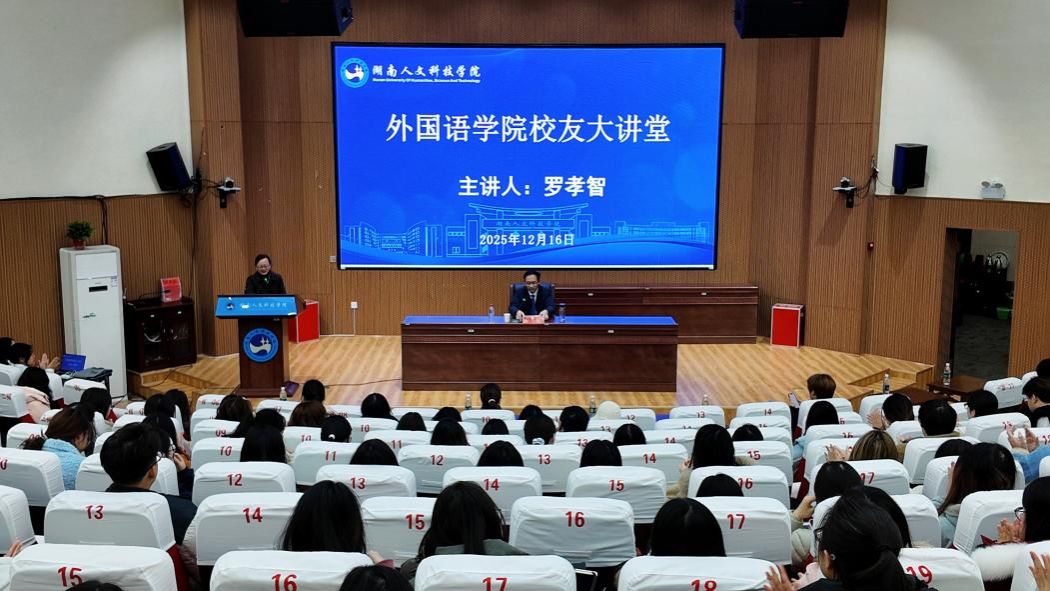 12月16日下午,外国语学院“校友大讲堂”在匠成楼报告厅如期举办。学院特邀优秀校友罗孝智重返校园,为大二、大三学生献上一场融思想深度与实践价值于一体的专题讲座,助力青年学子明晰成长方向、规划职业路径。外国语学院党总支书记李霞主持讲座。党总支副书记罗嗣安、副院长周萍、教授胡瑾等教师代表听取讲座。
