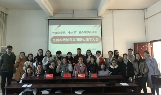 1月11日中午,我院在播馨楼406举行外国语学院"小火车"爱心帮扶直通车东莞华特教育集团爱心助学大会。华特教育集团总校长王浩平一行6人、外国语学院全体院领导、辅导员及资助学生代表出席本次大会。会议由党总支书记胡瑾主持。