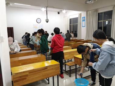 11月25日,外国语学院学工办朱倩老师在组织19级学生会干部开展清理“课桌文化”活动时,发明的课桌清洗液有奇效。