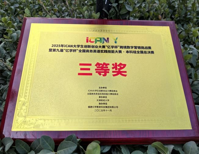 11月29日,2025年iCAN大学生创新创业大赛“亿学杯”跨境数字营销挑战赛暨第九届“亿学杯”全国商务英语实践技能大赛本科组全国总决赛在天津财经大学圆满落幕。iCAN大学生创新创业大赛是教育部官方认可的84项A类大学生学科竞赛之一,也是国内最具影响力的青年创新创业赛事之一。本届赛事汇聚了来自全国28个省份的300多所高校,共计1000余支队伍激烈角逐,最终仅有60支队伍脱颖而出,成功晋级全国总决赛。