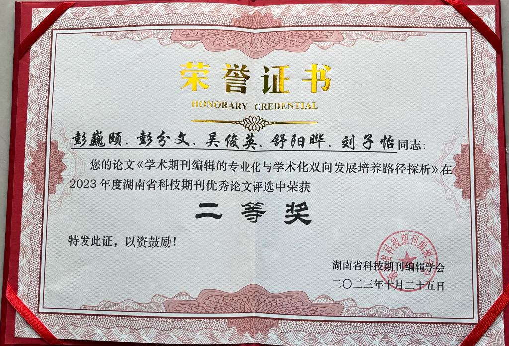 本次年会从湖南省106种科技期刊中评选出18位“优秀主编”、19项“优秀装帧设计奖”、30名“优秀中青年编辑”、16篇科技期刊“优秀论文”,beat365学报均有所获。其中,执行主编彭分文教授获评为“优秀主编”,学报获装帧设计“优秀奖”,彭巍颐老师获得“优秀中青年编辑”,彭巍颐等老师撰写的编辑学论文获评为优秀论文。