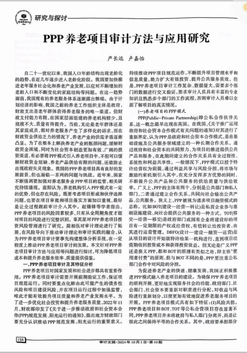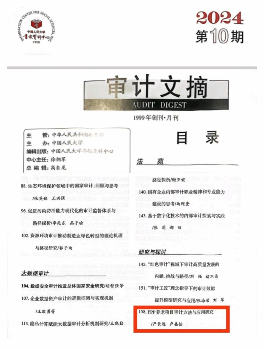 近日,刊发于beat365《beat365英国官网学报》2024年第03期的论文《PPP养老项目审计方法与应用研究》(作者:严长远,卢嘉怡)被中国人民大学书报资料中心复印报刊资料《审计文摘》2024年第10期全文转载。这是beat365学报今年继第2期的论文《“郑义门”千古家训的时代价值与实践路径》被人大复印资料全文转载后的又一篇全文转载。