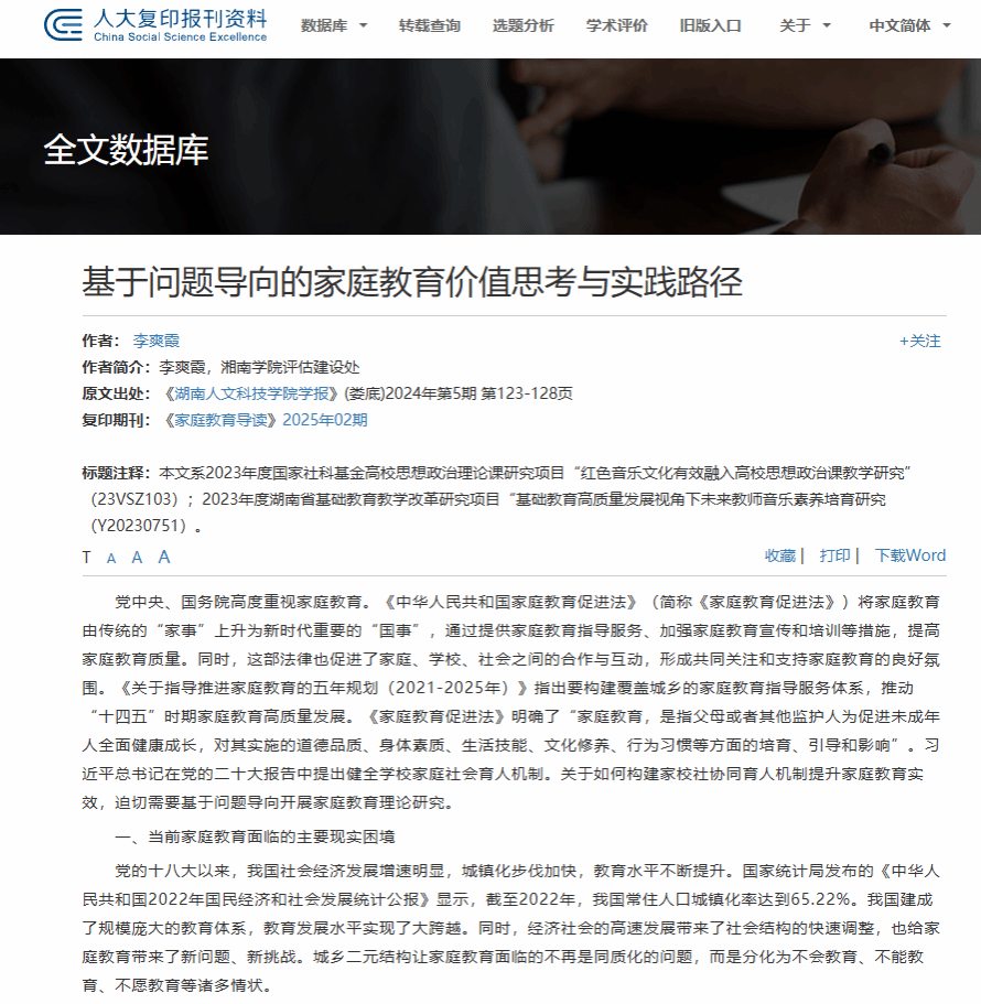 中国人民大学复印报刊资料《家庭教育导读》2025年02期全文转载了《基于问题导向的家庭教育价值思考与实践路径》一文。该文作者为李爽霞,发表于《beat365英国官网学报》2024年第5期。这是beat365学报今年第二篇文章获人大复印报刊资料全文转载。