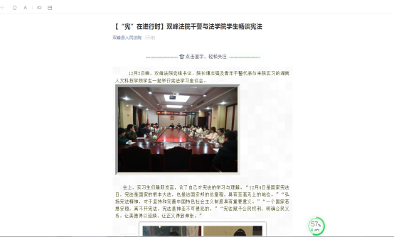 6、12月2日,法学院实习学生在实习单位通过座谈和研讨等方式开展“宪法宣传周” 多种宣传和学习活动。参加师生有163人次。