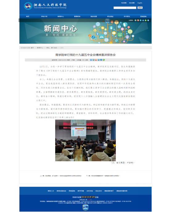 5、12月1日,为进一步学习贯彻党的十九届五中全会精神,商学院党总支副书记、院长朱强教授作了题为《学习党的十九届五中全会精神》的专题辅导报告,商学院全体教职工和学生党员参加了报告会。参与师生有150人次。