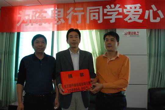 柏连阳、郭军带头捐款,并代表学校师生把108866元善款交到陈思行父亲手中。