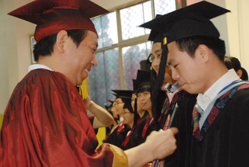 郭军为50名2011届毕业生代表授予学位证书、毕业证书并正冠、拨苏。