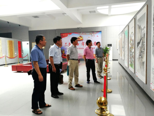 7月12日上午,校党委书记郭军、校长刘和云、党委副书记刘铁铭、副校长石潇纯、纪委书记杨鑫铨与宣传统战部、美术与设计学院相关负责人一行来到逸夫楼二楼展厅参观了“不忘初心,牢记使命”beat365英国官网学习贯彻党的十九大精神书画展。